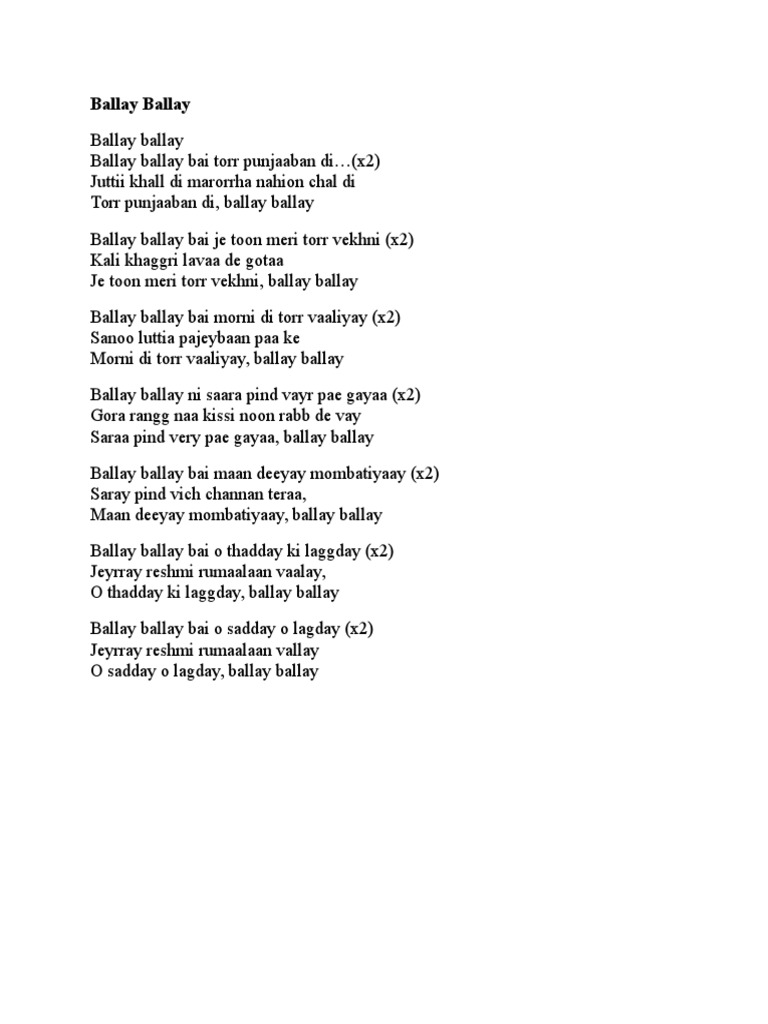 Ballay Ballay Song Lyrics - Maan enj nachdi jiwe gaan nachdi gidhay te aja saade naal ni ballay ballay bai tor punjaban di, bai ballay ballay bai tor punjaban di, o jutti khall di marodaan naiyo jhalldi, tor punjaban di.