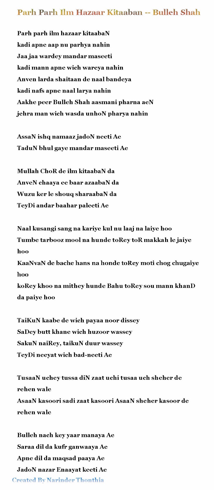 Bulleh Shah Kalam Lyrics In Hindi - Bulleh shah muntakhab kalam ma urdu tarjuma has 7 ratings and 1 review. Bulleh Shah Kalam Lyrics In Hindi : Main choohretri han sacche sahib de darbaron.