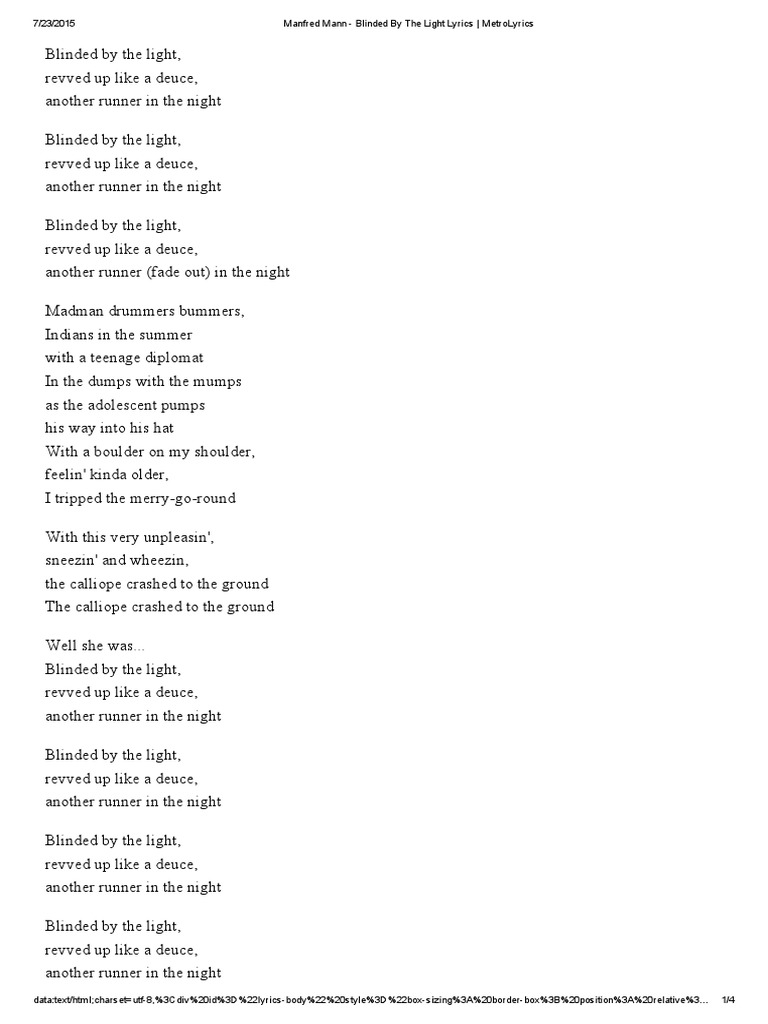Lyrics To Blinded By The Light By Manfred Mann - Blinded by the light, revved up like a deuce, another runner in the night blinded by the light, revved up like a deuce, anoth.