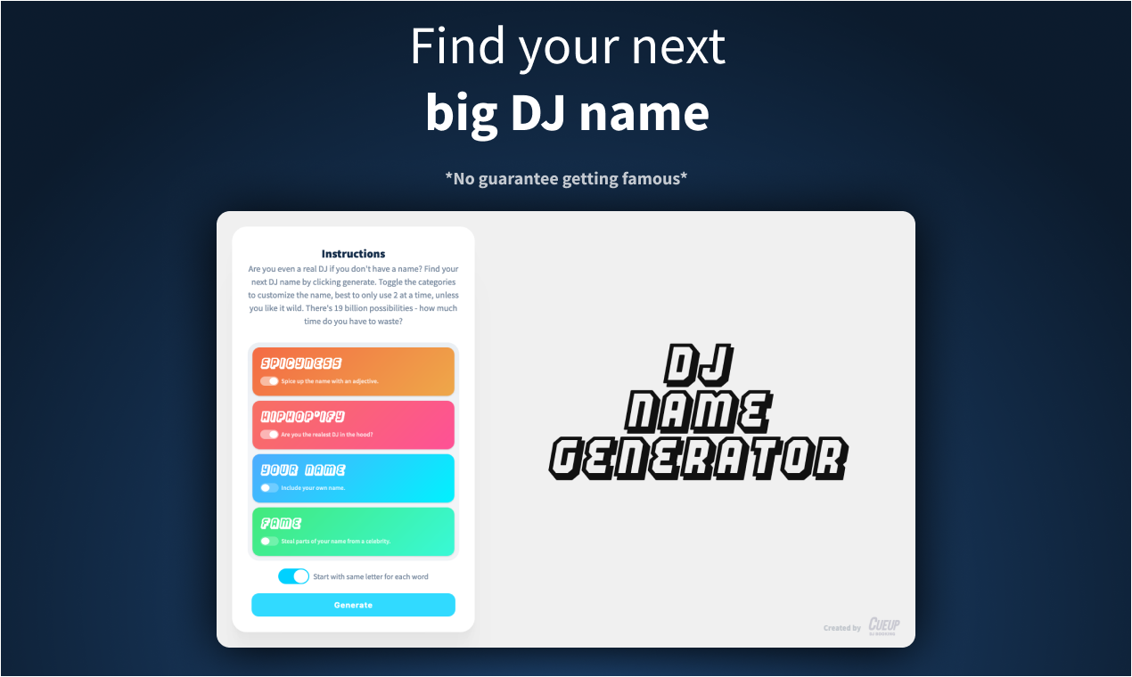 Random Dj Name Generator / Dj name generator type in your name below to find out your dj name generator. Random Dj Name Generator - Great for any disc jockey looking for a name that sticks.